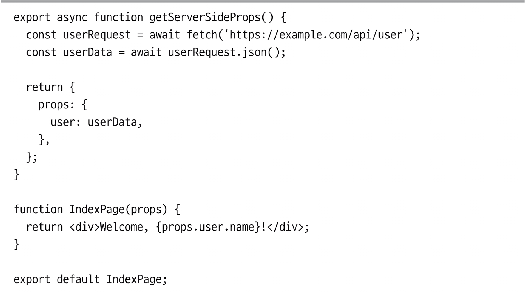 - getServerSIdeProps 함수는 props라는 속성값을 갖는 객체를 반환함. Next.js는 이 props를 컴포넌트로 전달하여 서버와 클라이언트 모두가 props에 접근하고 사용할 수 있음. fetch API는 Next.js를 통해 서버에서 실행되기 때문에 fetch API를 변도의 폴리폴로 끼워 넣을 필요는 없음.