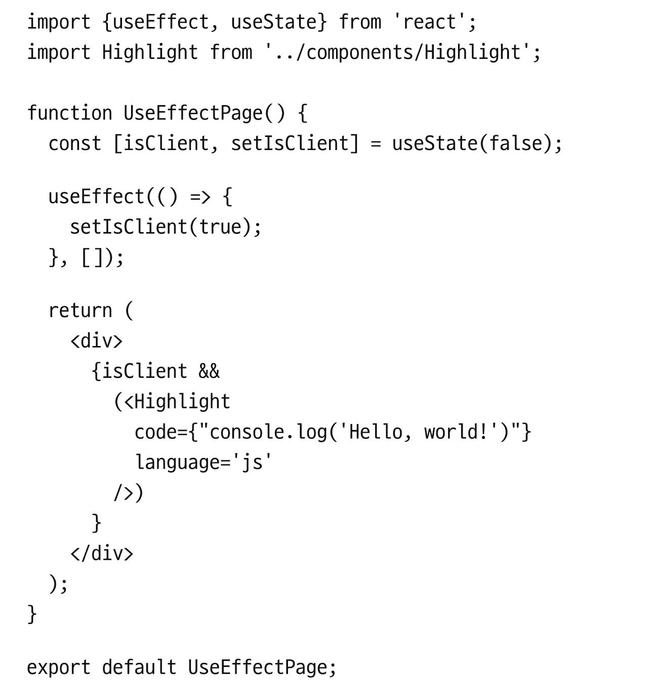 아래 사진처럼 useEffect와 useState를 이용하여 할 수 있음 그럼 브라우저에서만 렌더링 됨 (아래 사진에서 <Highligh> 컴포난토는 브라우저에서만 렌더링이 됨