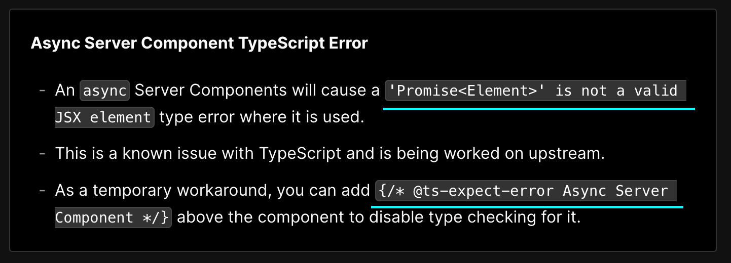 이 부분은 공식문서에서 나와있다. 공식문서에서는 임시로 {/* @ts-expect-error Async Server Component */} 를 사용해서 타입 검사를 비활성화하라고 한다. 현재 작업 중이어서 그렇다.