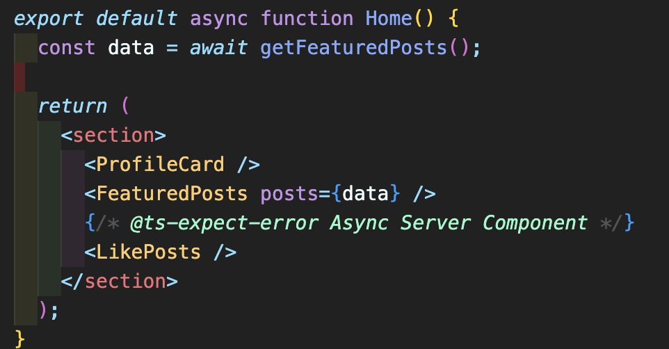 13 버전에서는 아래 LikePosts 컴포넌트처럼 컴포넌트를 async로 감싸주면 된다. 그리고 컴포넌트 안에다가 비동기 로직을 작성해 주면 된다.