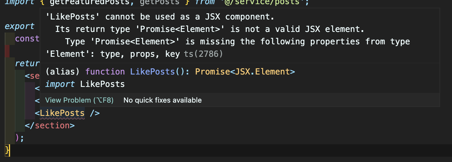 하지만 타입스크립트를 사용하면 아래처럼 "'Promise<Element>' is not a valid JSX element"이라는 타입에러가 발생한다.